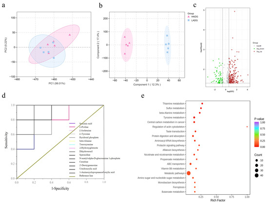(a,b) LADG vs. HADG group PCA (Shows an overall separation in the global rumen metabolome between HADG and LADG groups, indicating fundamental phenotypic differences) and OPLS-DA plots (Statistically confirms the group separation and identifies the specific metabolites (high VIP values) most responsible for discriminating the two phenotypes); (c) LADG vs. HADG group volcano plot of differential metabolites (Details the specific dysregulation, quantifying which metabolites are significantly upregulated or downregulated in LADG sheep, indicating a broad shift in rumen metabolic output); (d) LADG vs. HADG group ROC curve of differential metabolites (Validate the diagnostic power of key differential metabolites, transforming them from statistical hits into potential functional biomarkers for ADG status); (e) LADG vs. HADG group metabolic pathways of differential metabolites (Provides the mechanistic link, showing that these key metabolites are enriched in specific pathways relevant to energy metabolism and antioxidant capacity—directly supporting the proposed biological basis for growth efficiency differences).