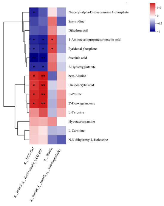 The analysis of the correlation between differential microbial genera and differential metabolites in the rumen of HADG and LADG groups of Tan sheep showed that UCG-002 and norank_f__Bacteroidales_UCG-001 were significantly negatively correlated with Succinic acid (p < 0.01), and significantly negatively correlated with 1-Aminocyclopropanccarboxylic acid, Pyridoxal phosphate, and 2-Hydroxyglutarate (p < 0.05). Beta-Alanine, Ureidoacrylic acid, L-Proline, and 2′-Deoxyguanosine were significantly positively correlated with norank_f__Bacteroidales_UCG-001 (p < 0.01), and significantly positively correlated with UCG-002 (p < 0.05) (Figure 3).