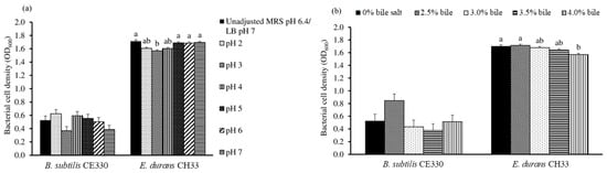Effect of pH 2.0 to 7.0 (a) and a bile salt concentration of 2.5 to 4.0% (b) on the OD600 of B. subtilis CE330 and E. durans CH33 cultures after 4 h of exposure to acidic or bile-salt-containing conditions. The bars are the means ± SEMs. Bars with no common letters within the same bacterial species differ significantly at p < 0.05. The p values of the pH tolerance test of B. subtilis CE330 and E. durans CH33 were 0.253 and 0.002, respectively. The p values of the bile salt tolerance test of B. subtilis CE330 and E. durans CH33 were 0.131 and 0.016, respectively. (n = 3).