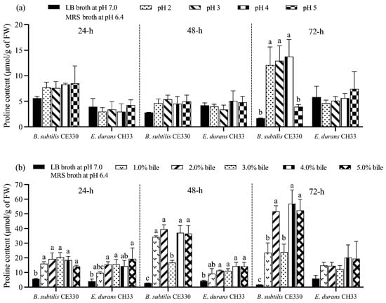 When B. subtilis CE330 was incubated with 2% bile salt at pH 7, the proline concentration significantly increased from 19.23 μmol/g at 24 h to 39.61 μmol/g of bacteria at 48 h (p < 0.001). Furthermore, after 72 h of incubation with 4% bile salt, the highest proline concentration was recorded for both strains. At 72 h, B. subtilis CE330 reached a proline concentration of 56.95 μmol/g (p < 0.001), while E. durans CH33 reached a proline concentration of 20.09 μmol/g of bacteria (p = 0.137) (Figure 3b).