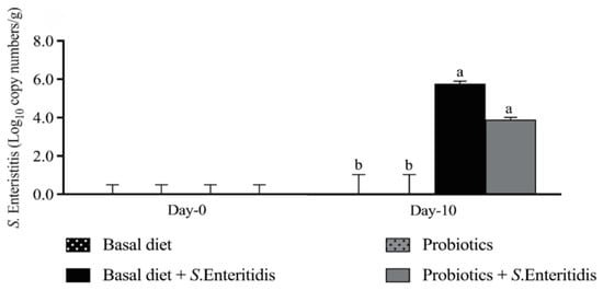 Effect of dietary supplementation with the B. subtilis CE330 and E. durans CH33 probiotic mixture on the concentration (Log10 copy number/g) of S. Enteritidis, in the ceca of 24 d old male broilers from both the nonchallenged group and S. Enteritidis-challenged group. The bars are means ± SEMs; n = 6 per treatment group. Bars with no common letters differ significantly at p < 0.05. Effect of probiotic supplementation and S. Enteritidis challenge on the cecal S. Enteritidis load. p value of treatment challenge = 0.3007, challenge = <0.0001, and treatment = 0.3773.