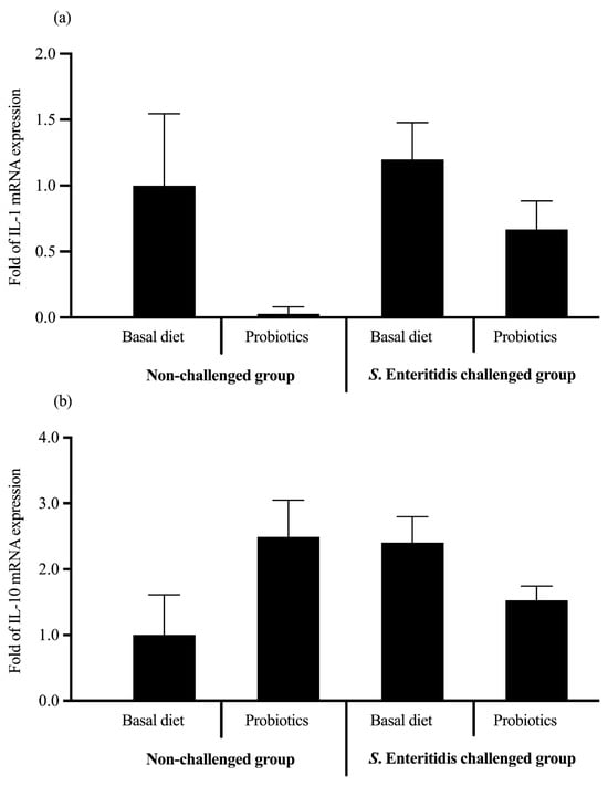 Effect of supplementation with the B. subtilis CE330 and E. durans CH33 probiotic mixture on the expression of (a) cecal tonsil IL-1β and (b) cecal tonsil IL-10 levels in 24 d old male broilers from both the nonchallenged group and S. Enteritidis-challenged group. The bars are means ± SEMs; n = 6 per treatment group. Two-way ANOVA of the results of the in vivo assay of the effect of probiotic supplementation and S. Enteritidis challenge on cecal tonsil IL-1β and IL-10 gene expression revealed no significant interaction or main effects (IL-1β: p value of treatment × challenge = 0.860, p value of challenge = 0.171, p value of treatment = 0.150; and IL-10: p value of treatment × challenge = 0.501, p value of challenge = 0.972, p value of treatment = 0.927, respectively).