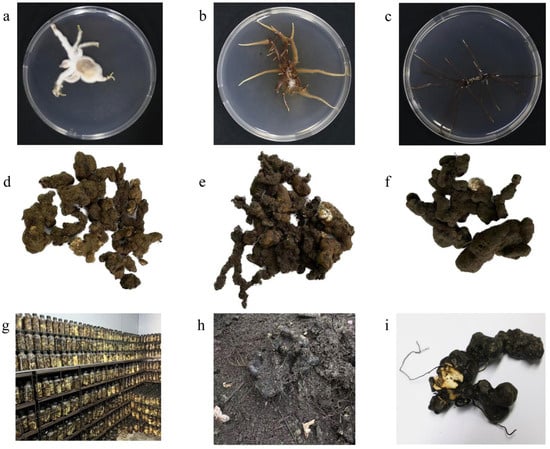 Colony morphology of strains A35, A541, and A19 on PDA medium after 15 days, and P. umbellatus sclerotia (A35-P, A541-P, and A19-P) obtained after four years of co-cultivation: (a) A35 grown on PDA medium at room temperature in the dark for 2 weeks; (b) A541 grown on PDA medium under the same conditions; (c) A19 grown on PDA medium under identical conditions; (d) A35-P sclerotia excavated from a nest of P. umbellatus co-cultivated with A35 for four years; (e) A541-P sclerotia excavated from a nest co-cultivated with A541 for four years; (f) A19-P sclerotia excavated from a nest co-cultivated with A19 for four years; (g) Armillaria spawn; (h) P. umbellatus co-cultivated with Armillaria in soil; and (i) Armillaria infecting P. umbellatus.