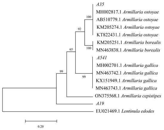 Fresh rhizomorphs of A35, A541, and A19, cultured on PDA for approximately 15 days, were collected and ground into powder using liquid nitrogen to facilitate DNA extraction. DNA was extracted following the instructions provided in the DNA extraction kit (Aidlab, Beijing, China). The partial TEF-1α (transcription elongation factor) gene was amplified using the primer pair TEF-F (5′-GGCATCGAGGAGAGAGTCTTG-3′) and TEF-R (5′-TATCTCCAAGGACGGGCAGA-3′) []. The PCR amplification system consisted of 12.5 μL of 2× Taq Master Mix (Vazyme, Nanjing, China), 1 μL of each primer (10 μmol·L−1), 2 μL of DNA template, and 8.5 μL of ddH2O, for a total reaction volume of 25 μL. The reaction conditions were as follows: initial denaturation at 95 °C for 3 min, followed by 34 cycles of denaturation at 95 °C for 15 s, annealing at 60 °C for 15 s, and extension at 72 °C for 60 s, with a final extension step at 72 °C for 5 min. The PCR products were sequenced by RuiBiotech Co., Ltd., Beijing, China.