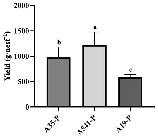 Statistical analysis differences in yield (g·nest−1) of A35-P, A541-P, and A19-P. Different lowercase letters show significant differences at the p < 0.05 level.