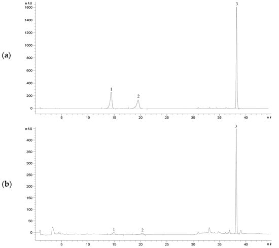HPLC chromatograms for the determination of ergosterol, polyporusterone A, and polyporusterone B contents in P. umbellatus samples. (a) Chromatogram of the reference substances: polyporusterone B (1), polyporusterone A (2), and ergosterol (3); (b) chromatogram of substances 1–3 detected in P. umbellatus samples. The detection wavelength was set to 247 nm for the first 25 min and switched to 283 nm after 25 min.