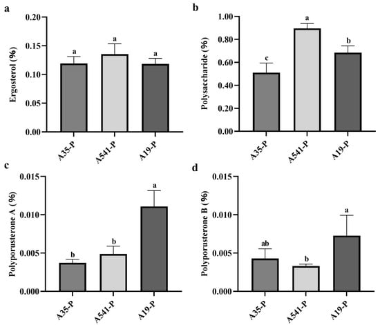 Statistical analysis of ergosterol, polysaccharide, polyporusterone A, and polyporusterone B contents in A35-P, A541-P, and A19-P. (a) Ergosterol content (%) in A35-P, A541-P, and A19-P; (b) polysaccharide content (%) in A35-P, A541-P, and A19-P; (c) polyporusterone A content (%) in A35-P, A541-P, and A19-P; and (d) polyporusterone B content (%) in A35-P, A541-P, and A19-P. Different lowercase letters indicate significant differences at the p < 0.05 level.