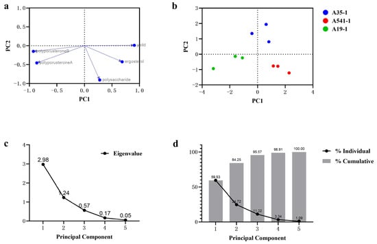 PCA of A35-P, A541-P, and A19-P samples based on yield, ergosterol, polyporusterone A, polyporusterone B, and polysaccharide contents. (a) The loading plot depicts the grouping of variables using the first two principal components. Yield, ergosterol, polyporusterone A, and polyporusterone B contents showed strong correlations (values close to 1 or −1) with PC1, while polysaccharide content was primarily correlated with PC2. (b) The PC score plot displays the original eigenvalues of each principal component, illustrating clustering patterns for the three sample groups. (c) The scree plot indicates that the eigenvalues of PC1 and PC2 were greater than 1, with the variance trend stabilizing after PC3. (d) The proportion of variance plot reveals that the first (PC1) accounted for 59.53% of the total variation, while the cumulative variance of PC1 and PC2 explained 84.25% of the total variation.