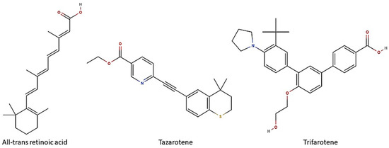 Retinoids and their chemical structure. All-trans retinoic acid (ATRA) or tretinoin are obtained by chemically modifying the polar groups of vitamin A; tazarotene is a polycyclic molecule, resulting from the cyclization of a side chain; trifarotene, a synthetized fourth-generation retinoid, belongs to the class of terphenyls with a structure containing the 1,3-diphenylbenzene skeleton. Created using molView® (https://molview.org/, accessed on 25 November 2024).