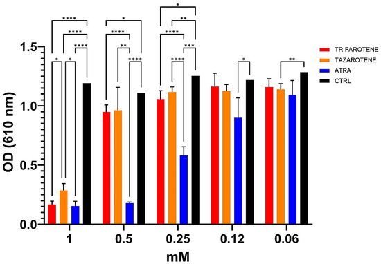 In our previous work, ATRA was found to exert an inhibitory activity against the growth and biofilm formation of C. albicans in a dose-dependent manner [20]. In the present study, we investigated the effectiveness of trifarotene and tazarotene, compared to ATRA, in inhibiting Candida growth. As shown in Figure 2, both the drugs at concentrations ranging from 1.0 to 0.5 mM, significantly (one-way ANOVA, p < 0.0001) inhibited Candida growth, with 1 mM resulting as the most effective concentration, inducing a reduction by 88% in fungal growth, similar to that achieved with ATRA (90%). At a concentration of 0.5 mM, trifarotene significantly inhibited Candida growth in comparison with tazarotene (82% and 70%, respectively) (two-way ANOVA, p < 0.001) and, interestingly, its efficacy was comparable to that of ATRA (85%), although at 0.25 mM the efficacy of ATRA was significantly higher than that of trifarotene (50% and 35% inhibition, respectively) (two-way ANOVA, p < 0.0001). Overall, the results suggest that at concentrations of 1.0 and 0.5 mM, the antifungal activity of trifarotene in inhibiting Candida growth was higher than that of tazarotene and fully comparable to that of ATRA.