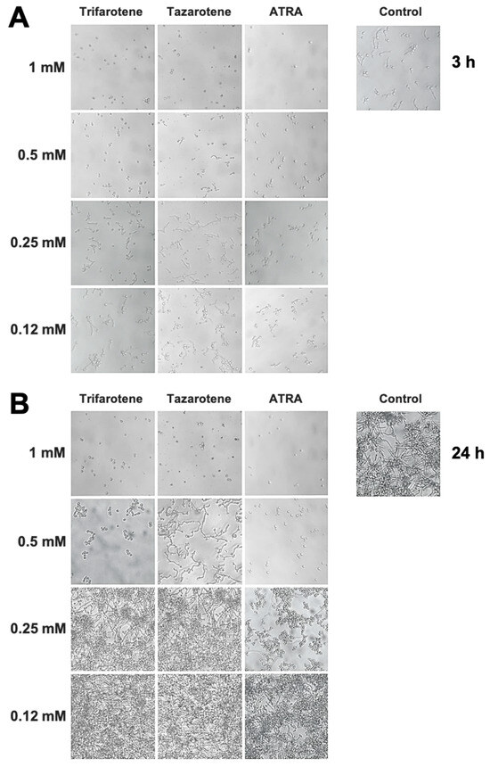 We have evaluated also the impact of trifarotene and tazarotene on C. albicans dimorphic transition between yeast and hyphal growth forms since this process represents a critical step in biofilm formation [49,50]. The microscopic images of Candida cultures reported in Figure 3A show that, at the earliest time point (3 h), while Candida control cells developed appreciable germ tubes, the treatment with trifarotene and tazarotene at the highest tested concentration (1.0 mM) was able to completely block C. albicans germination, similar to ATRA. However, while 0.5 mM trifarotene and ATRA could still inhibit Candida germination, the same concentration of tazarotene failed to block germ tube formation. Low concentrations of trifarotene (0.25 and 0.12 mM) appeared not to be able to block yeast–hyphal dimorphic transition, as documented by the visible development of germ tubes, whereas this phenomenon was found to be strongly inhibited by exposure to 0.25 or 0.12 mM ATRA. Of note, as reported in Figure 3B, the inhibitory effect of 1.0 and 0.5 mM trifarotene or 1.0 mM tazarotene on Candida germination was maintained even at a late time (24 h after treatment), with respect to untreated control cells that grew as long filamentous hyphae.
