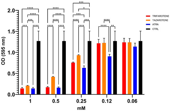 We also evaluated the potential anti-biofilm effects of trifarotene and tazarotene on C. albicans biofilm, compared to ATRA, in terms of total biomass by CV staining assay. Data shown in Figure 4 indicate that at concentrations ranging from 1.0 mM to 0.25 mM both retinoids significantly inhibited the biofilm biomass production by C. albicans compared with controls (one-way ANOVA; p < 0.0001). In detail, at the highest concentration of 1.0 mM, no statistically significant differences were found between the anti-biofilm activity of trifarotene, tazarotene and ATRA. However, concentrations lower than 1.0 mM (between 0.5 and 0.25 mM) of trifarotene proved to be significantly more effective than the same concentrations of tazarotene (two-way ANOVA; p < 0.001), but less effective than the same concentration of ATRA at 0.25 mM (two-way ANOVA; p < 0.001). Moreover, ATRA, even at a low concentration of 0.12 mM, significantly inhibited Candida biofilm biomass compared with the same concentrations of trifarotene and tazarotene (two-way ANOVA; p < 0.001), which appeared to have no effect on biomass production.