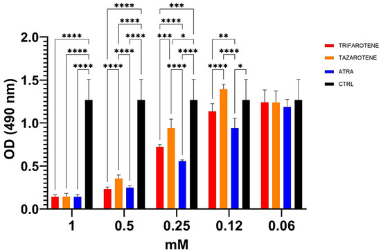 Based on the aforementioned results, the impact of trifarotene and tazarotene on the metabolic activity of Candida biofilm was also studied by XTT reduction assay. Data reported in Figure 5 show that at concentrations ranging from 1.0 mM to 0.25 mM, both retinoids significantly reduced the metabolic activity of Candida biofilm, while at 0.12 mM only trifarotene, similarly to ATRA, maintained a significant inhibitory activity (one-way ANOVA; p < 0.001) in comparison with untreated controls. The comparative analyses also indicate that at the high concentrations of 1.0 mM and 0.5 mM all the three retinoids exhibited similar antifungal efficacy. In fact, at these concentrations, no statistically significant differences were observed between trifarotene, tazarotene and ATRA (two-way ANOVA, p > 0.05) at 1 mM. However, 0.25 mM trifarotene and 0.25 mM ATRA showed a higher inhibitory effect than tazarotene (two-way ANOVA; p < 0.001 and p < 0.0001, respectively), whereas 0.12 mM ATRA was more effective than 0.12 mM trifarotene (two-way ANOVA; p < 0.001).