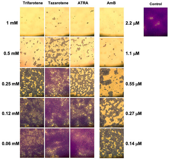 The impact of the tested retinoids on the total biomass was also evaluated by means of a light microscope after CV staining. The images reported in Figure 6 confirm that the greatest inhibitory effect on the biofilm biomass was obtained with the highest concentrations of trifarotene and tazarotene (1.0 and 0.5 mM). While at 1.0 mM no differences were found between trifarotene and tazarotene, at 0.5 mM trifarotene exhibited greater inhibition than tazarotene. Additionally, at 0.25 mM all the three retinoids showed a relatively good inhibitory effect against Candida biofilm biomass compared with the untreated control, although the anti-biofilm activity exerted by trifarotene and ATRA appeared to be higher than that of tazarotene. Altogether these results strongly confirm the negative impact of the three retinoids at the highest tested concentrations (1.0 and 0.5 mM) on Candida hyphal growth.
