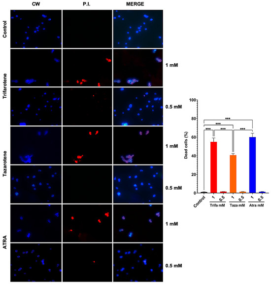 To evaluate whether the antifungal effect of trifarotene and tazarotene on Candida growth and biofilm formation was due to a fungistatic or fungicidal activity, we assessed the vitality of C. albicans cells by immunofluorescence double staining with CW and PI. Calcofluor White stains the fungal cell wall blue, regardless of its metabolic state, while PI binds to the DNA of dead cells and emits red fluorescence. The microscopic images in Figure 7 show that exposure to 1.0 mM trifarotene or tazarotene resulted in 55% and 40% of PI positive non-viable cells, respectively, vs. 60% of ATRA. By contrast, concentrations of each agent under 0.5 mM resulted in less than 2% of PI positive cells, a value very close to Candida control cells. Overall, the results suggest that these molecules are able to exert an inhibitory activity on the growth and biofilm formation in C. albicans by working either as fungicidal or fungistatic drugs, depending on the concentration used.