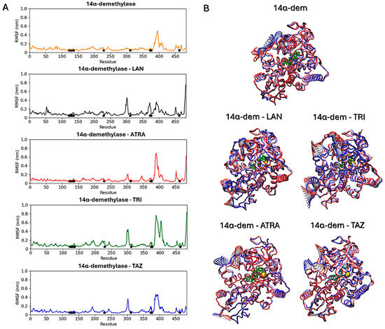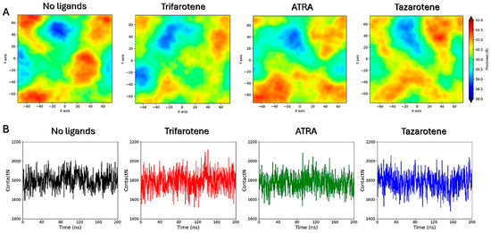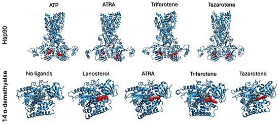 Subsequent analyses focused on evaluating ligands’ effects on the proteins’ structural dynamics. To this aim, RMSF calculations were carried out to identify the most flexible regions in the proteins’ structures (Figure 10 and Figure 11). For Hsp90, two regions in the two monomers show altered fluctuations in the four systems (Figure 10A). As shown in the figure, this interval corresponds to a loop region near the ATP-binding pocket. In the protein active state, bound to ATP, intermediate flexibility is observed for this loop, while this region is stabilized in the presence of ATRA and subject to higher flexibility in the presence of trifarotene or tazarotene. Almost the same effect is observed for both monomers and a greater effect in the presence of trifarotene. Principal component analysis (PCA) [51] was carried out for each trajectory to identify the major alterations in proteins’ motions. Projections of the first eigenvector on each protein 3D structure allow a visualization of the most flexible regions, visually highlighting how the presence of trifarotene induces higher flexibility and reorganization in the regions surrounding the ATP-binding sites in comparison with the protein native state or in complex with the other retinoids (Figure 10B). For 14α-demethylase (Figure 11), alterations in flexibility can be noted from residues 280 to 475, representing helical and loop regions, also including ligands’ binding residues. An evident increase in flexibility of residues 375–425 can be observed in the presence of trifarotene or ATRA, and in residues 280 to 325 in the presence of trifarotene, tazarotene or lanosterol. In this case, the strongest effect on protein dynamics is induced by trifarotene binding, as can be observed from the projection of the first eigenvector on the proteins’ 3D structures (Figure 11B). In comparison with the unliganded or lanosterol-bound 14α-demethylase, in the presence of trifarotene the protein is more destabilized with the presence of different motions and flexible regions. In conclusion, these results suggest that all three retinoids, and particularly trifarotene, may represent favorable and stable interactors for these proteins, capable of competing with their native ligands. Moreover, all retinoids appear to influence the structural dynamics of the proteins, particularly for flexible regions located close to the compounds’ binding pockets.