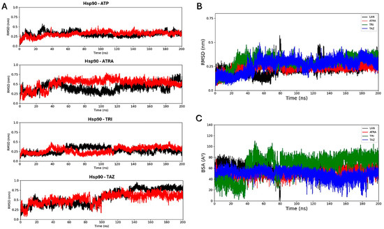 Root mean square deviation analyses. RMSD calculated for each ligand within the Hsp90 dimer, with the two monomers indicated in black and red (A). Ligands’ RMSDs calculated for the 14α-demethylase systems (B). Buried surface area (BSA) calculated between the 14α-demethylase heme and each ligand (C). ATP, Adenosine triphosphate; ATRA, all-trans retinoic acid; LAN, lanosterol; TAZ, tazarotene; TRI, trifarotene.