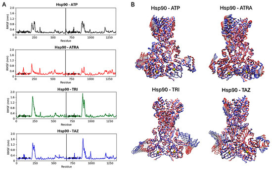Hsp90 dimers RMSF analyses. Black points indicate residues involved in the ligands’ binding. The vertical lines indicate the separation between the two monomers (A). Projections of the first eigenvectors obtained from PCA analyses on the proteins’ 3D structures. Proteins are shown as tubes, and colors from red to blue indicate the proteins’ motions from the beginning to the end of the simulations. The ligands’ locations are indicated by yellow spheres (B). ATP, Adenosine triphosphate; ATRA, all-trans retinoic acid; LAN, lanosterol; TAZ, tazarotene; TRI, trifarotene.