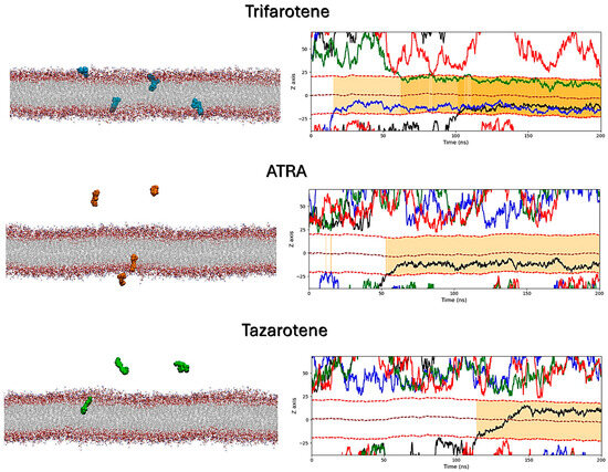 MD simulations were performed to atomistically evaluate the effect of four molecules of trifarotene, ATRA or tazarotene when approaching a bilayer mimicking the C. albicans membrane. Simulation systems including ten ligand molecules were also simulated, but these results were discarded since the formation of large ligands’ aggregates prevented their insertion in the membrane. Simulations showed that trifarotene has a higher tendency to insert within the fungal membrane, with three out of four ligands inserted within the membrane after about 200 ns of simulation (Figure 12). On the other hand, only one ATRA or tazarotene molecule inserted in the bilayer during the 200 ns (Figure 12). Notably, translocation of tazarotene towards the opposite membrane leaflet is observed. The insertion of trifarotene leads to an alteration in the dynamical behavior of the membrane, decreasing membrane thickness and increasing lipids bilayer interdigitation; that is, the average number of contacts established between the upper and lower monolayer (Figure 13). These effects are not observed for the membrane–ATRA system and are less evident for the membrane–tazarotene system, probably because one inserted molecule is not sufficient to induce evident alterations. Interaction analyses indicate that only one molecule of trifarotene and ATRA tends to closely interact with ergosterol for about 50% of the simulation time, while the inserted tazarotene contacts ergosterol for only 25% of the simulation time. The other two inserted trifarotene molecules preferentially bind to phosphatidylcholines (POPC). MM/GBSA analyses were performed for all inserted molecules. For the three inserted trifarotene, ΔGbinding of −13.7 ± 0.2, −15.1 ± 0.2 and −15.0 ± 0.2 kcal/mol were obtained; a similar value of −11.0 ± 0.14 kcal/mol resulted for ATRA, while a higher ΔGbinding of −24.6 ± 0.3 kcal/mol for tazarotene. The higher affinity of tazarotene for the membrane is mostly due to its interactions with the POPC lipids rather than ergosterol. Overall, trifarotene shows a higher affinity than ATRA for the C. albicans membrane and particularly ergosterol, resulting in the insertion of more molecules during the same simulation time. The insertion of at least three trifarotene molecules can induce evident effects on this membrane model system, altering the normal thickness and fluidity of the fungal membrane. In a living system, these effects could be translated to a higher scale resulting in the induction of an altered and damaged membrane function, which could also affect the functionality of surrounding transmembrane proteins.