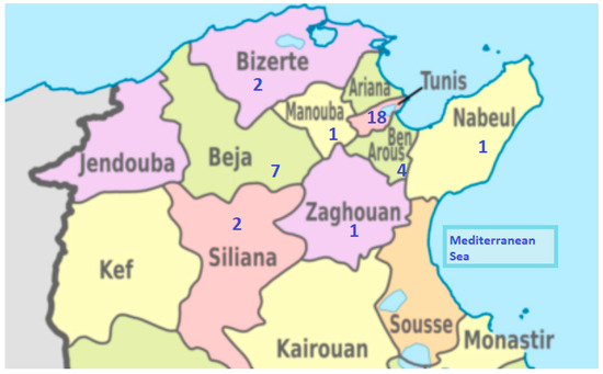 The distribution of B. melitensis strains collected from Tunisian infected humans in the 2015–2017 period.The figure indicates the number of B. melitensis strains isolated in each of eight governorates: Nabeul (1), Mannouba (1), Zaghouan (1), Bizertz (2), Tunis (18), Beja (7) and Seliana (2).