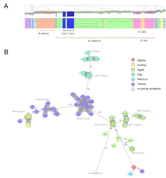 Core genome Multilocus Sequence Typing (cgMLST)-based population trees of Brucella isolates. (A) Neighbor-joining tree of >1000 Brucella spp. isolates revealing two genetically close clusters of Tunisian B. melitensis isolates within global population structure. (B) Minimum spanning tree of 36 Tunisian B. melitensis isolates and their closest relatives color-coded by geographic origin. Distance labels correspond to number of discriminating alleles.