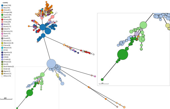 Both tested schemes used to determine genetic relatedness between the isolates were comparable and revealed identical groupings. with only few-allele differences between the two assays. Within the global population structure, Tunisian isolates form two distinct clusters with a distance of 140 discriminating alleles. Within the proposed clusters, strains differed in up to 6 alleles, with 14 isolates from the proposed Tunisia Cluster 1 showing not a single discriminatory allele. In addition, the MST shows that the Tunisian clusters are most closely related to countries in geographical proximity, with 150 discriminating alleles to Egypt, 245 to Algeria, and 266 to Morocco (Figure 2 and Figure 3). Of the thirty-six analyzed strains, five did not belong to any cluster, with one of them being very closely related to the proposed Tunisia Cluster 1. One of these isolates appears to be most closely related to single isolates from Morocco and Algeria. Interestingly, with less than 30 discriminating alleles, isolates from an outbreak in Austria cluster very closely to the proposed Tunisia Cluster 2 and three other strains from this sample set which could not be allocated to a cluster.