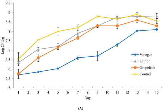 On day one of store-bought catfish, the control total bacterial count was 6.5 Log CFU/g. After 30 min of marinating in each preservative, the total bacterial count was reduced to 6.3, 5.8, and 5.7 Log CFU/g for lemon, GSE, and vinegar treatments, respectively (Figure 1A). In subsequent days, an increasing gap developed between the treatment and control groups. By the endpoint (Day 15), the control and GSE-treated samples entered the death point, while lemon and vinegar-treated samples entered the stationary point.