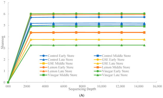 Rarefaction curves for store-bought (A) and aquaculture-raised (B) samples. Each sequencing depth was measured and compared using the Shannon index. Samples were treated with lemon, GSE, and vinegar at different storage points.
