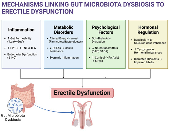 The bidirectional relationship between the gut–brain axis and hormonal pathways further supports the potential role of gut microbiota in ED. Dysbiosis can lead to alterations in neurotransmitter production, immune activation, and hypothalamic–pituitary–adrenal (HPA) axis regulation, potentially affecting mood and stress levels, which are known to influence erectile function [19]. These processes are critical in maintaining vascular health and regulating sex hormones, both essential for erectile function [20].