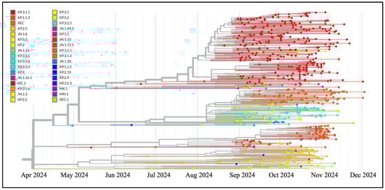 The time-scaled phylogenetic tree highlights strains within a global representative subsample of 491 out of 4063 SARS-CoV-2 genomes collected between April and December 2024. The phylogenetic analysis was performed using the nextstrain/ncov tool (https://github.com/nextstrain/ncov, accessed on 4 December 2024) and is available at https://gisaid.org/phylodynamics/global/nextstrain/ (accessed on 4 December 2024). The figure was refined using GIMP 2.8 software (available at https://www.gimp.org/downloads/oldstable/, accessed on 6 December 2024).