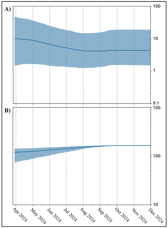Bayesian Skyline Plot—BSP (A)—and Lineages Through Time—LLT (B)—of the recombinant lineage SARS-CoV-2 XEC. The viral effective population size (A) and the number of lineages (B) in the y-axis are plotted on the y-axis against the corresponding dates on the x-axis. The figure was refined using GIMP 2.8 software (available at https://www.gimp.org/downloads/oldstable/, accessed on 6 December 2024).