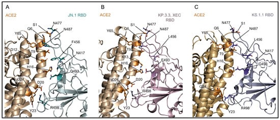 Comparison of the interfaces between ACE2 (orange) and the RBD of the JN.1 (A), KP.3.3 and XEC (B), and KS.1.1 (C) variants. Protein backbone is displayed as cartoon models while relevant side chains are depicted as labeled stick models.
