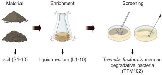 Each sample was enriched and induced using liquid medium with a sole carbon source, that is, 0.2 g of the sample was added to 5 mL of TFP medium (2 mg/mL TFP with 10% inorganic salt). The culture was shaken at 30 °C for 72 h at 160 rpm. Enrichment and induction were repeated 3 times at 5% inoculum. The polysaccharide utilization was eluted by high-performance size exclusion chromatography and detected by a refractive index detector (HPSEC-RID) (Agilent 1260, Agilent Technologies, Santa Cruz, CA, USA), which eluted with a TSKgel SuperAW4000 column (Cytiva, Uppsala, Sweden). The eluent was 0.2 M NaCl, and the flow rate was set at 0.4 mL/min. The bacteria that were able to utilize the substrate were further screened by coating in TFP solid medium (TFP liquid medium supplemented with 2% agar) and cultured at 30 °C for 72 h. Single colonies were picked and inoculated in liquid medium and incubated at 30 °C and 160 rpm for 48–72 h. The culture supernatant and cell lysate supernatant were taken to treat the substrate, and the enzyme activity inside and outside the cell was determined using HPSEC-RID.