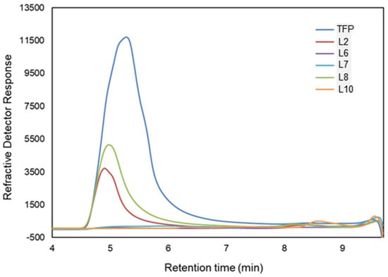TF is grown and cultured in various areas of China, including wild- and basswood-cultured TF in Sichuan, as well as bag-cultured TF in Fujian, Guangzhou, Linyi, and others. In order to screen for bacteria with TFP degradation ability, 10 samples of microbial environments were collected from sources in different regions (see Table S1 for sample source information). TFPs were used as the sole carbon source to enrich and induce the bacteria in the samples. The content and molecular weight changes of carbon sources in the culture solution were determined using HPSEC as a measure of the carbon source utilization by the microbiota. The results showed that microorganisms in samples L2, L6, L7, L8, and L10 were able to degrade and substantially utilize TFPs (Figure 2). The degradation rates of L6, L7, and L10 all reached about 99%, while L2 and L8 could reach 85% and 67%, respectively. Meanwhile, microorganisms involved in TFPs degradation and utilization were greatly enriched and exhibited advantages.