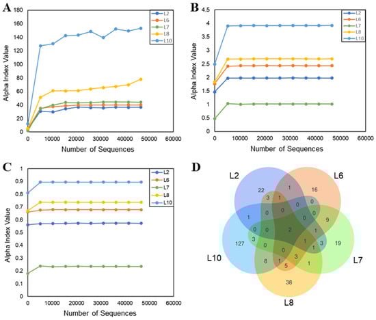 Alpha diversity analysis (Chao1, Shannon, and Simpson indices) showed that L10 had high species diversity and prominent dominant species, followed by L8 (Figure 3A–C). The Venn diagram showed the common, unique feature ASVs between different samples, and each circle in the diagram represented a sample. The numbers in the overlapping part of the circles represent the feature ASVs common among the samples, and the numbers in the non-overlapping part represent the feature ASVs unique to the samples. As can be seen by the Venn, species overlap was low between the five samples, with only two common ASVs (Figure 3D). L10 had the most unique ASVs, followed by L8. All of these results were positively correlated with the excellent growth capacity and stability of L10 and L8, especially L10. Moreover, L10 and L8 had eight common ASVs, suggesting that the two more dominant TFP-degrading bacteria have partially identical characteristic species.