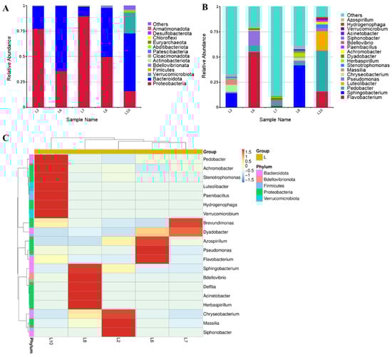 Histograms of species relative abundance at the phylum (A) and genus (B) levels, and a clustered heat map of species abundance at the genus level (C). “Others” indicates the sum of the relative abundances of all phyla other than the 10 in the figure. The horizontal coordinate of the heat map is the sample name, and the vertical coordinate is the annotation information of the species. The clustering tree on the left side of the figure is the species clustering tree. The color gradient from blue to red indicates the relative abundance of each species within the samples, where blue represents low abundance and red represents high abundance.