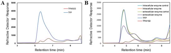 HPSEC-RID chromatogram of changes in TFPs content of the culture medium after utilization by TFM102 (A) and its intracellular and extracellular enzymes (B). The TSKgel SuperAW4000 column was utilized for the determination of polysaccharides.