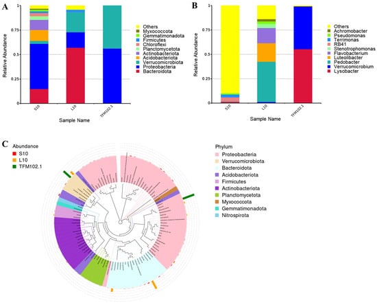 To characterize the changes in the microbial structure of TFM102 from soil to enrichment and screening, the species diversity and relative abundance of TFM102 were compared with its soil sample S10 and enrichment sample L10 (Figure 6A, B). In the process of enriching microorganisms in the soil, at the level of phylum, species of Bacteroidetes, Proteobacteria, and Verrucomicrobiota entrenched their predominance. Acidobacteriota and Actinobacteriota, which occupied a certain percentage of the soil, disappeared after enrichment. Bacteria of Acidobacteriota play an important role in the ecosystem [], while the most bacteria in Actinobacteriota are saprophytes, both of which are ubiquitous soil bacteria. At the genus level, 246, 52, and 3 genera were annotated in S10, L10, and TFM102, respectively, and the top 10 genera of the three samples and their proportions were shown in Figure 6B. There were no obvious dominant species in S10, consistent with the diverse and complex microbial environment in the soil []. After enrichment, obvious dominant species appeared in L10, including Pedobacter, Flavobacterium of Bacteroidetes, and Luteolibacter of Verrucomicrobiota, suggesting that the liquid medium containing TFPs influenced the changes in microbial structure.