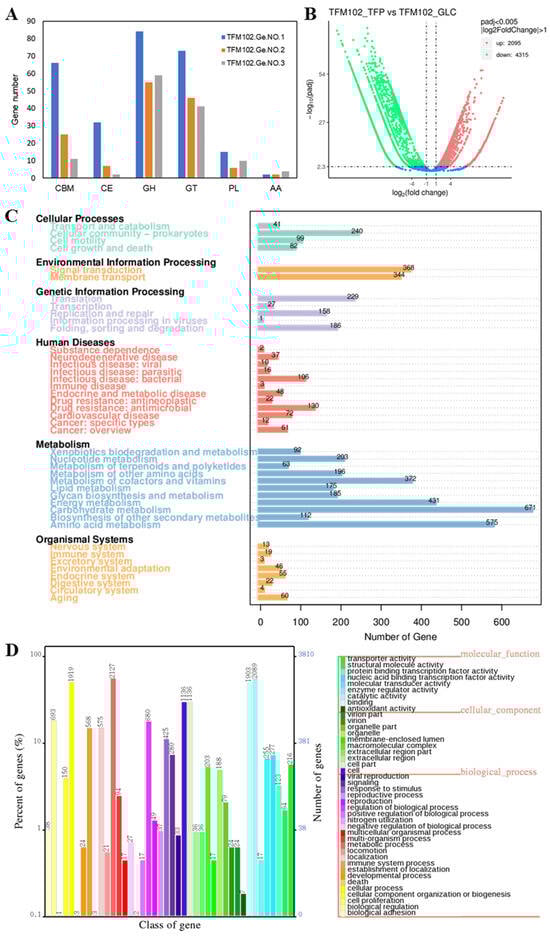 Gene function annotations by metagenome and macro-transcriptomics. (A) The bar chart illustrates the CAZy functional classification and the corresponding gene counts for each sample. (B) The volcano plot illustrates the overall distribution of genes with significant differential expression. Up-regulated genes are represented by red dots, while downregulated genes by green dots, and the blue dots represent non-differentiated genes. The statistical plot shows the number of genes annotated in each sample within the GO database (C) and the KEGG database (D). The numbers on the bars represent the counts of annotated genes.