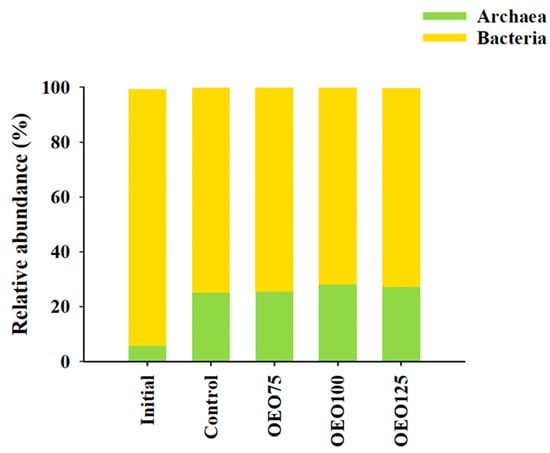 Taxonomic composition at the domain level of initial samples and experimental groups (Control, OEO75, OEO100, and OEO125) of striped bass (M. saxatilis) archaeal and bacterial gut microbiota. Observe that the archaea domain is less abundant in the initial samples than in the experimental groups.
