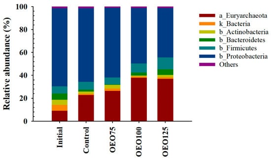 Taxonomic composition at phylum level of initial samples and experimental groups (Control, OEO75, OEO100, and OEO125) of striped bass (M. saxatilis) archaeal (a) and bacterial (b) gut microbiota. Some bacterial reads were only classified to domain level (k).