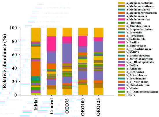 Taxonomic composition at genus level of initial samples and experimental groups (Control, OEO75, OEO100, and OEO125) of striped bass (M. saxatilis) bacterial (b) and archaeal (a) gut microbiota. Some bacterial reads were only classified to domain level (k_), order level (b_o), and family level (b_f).