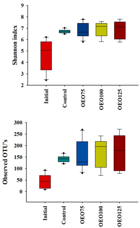 Box plot of Shannon Index and Observed OTUs for alpha diversity of the gut microbiota of striped bass experimental groups (Control, OEO75, OEO100, and OEO125) and initial samples. The control group exhibited less variability in the Shannon index and observed OTUs than the experimental groups. Additionally, initial samples show less richness and OTUs than the experimental groups.