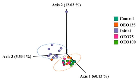 For the beta diversity, PCoA separately clustered the initial samples and experimental groups, forming two groups (Figure 5). These differences between experimental groups were further corroborated by PERMANOVA using the weighted UniFrac distances, where a dissimilarity was evidenced in all paired comparisons between the initial samples and experimental groups (control, OEO75, OEO100, and OEO125) (p < 0.01).