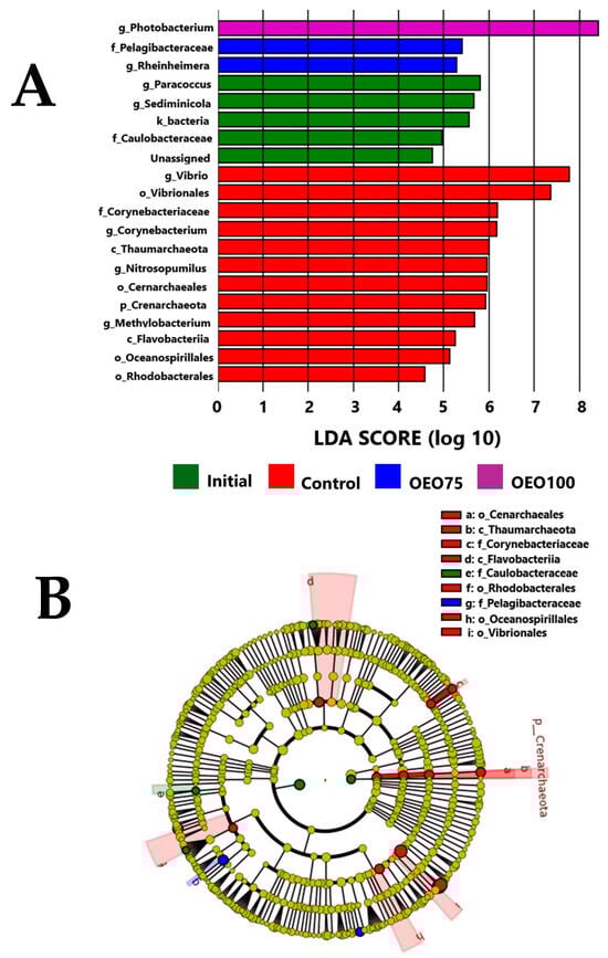 (A) Differential expressed taxa of the gut microbiota of striped bass experimental groups (Control, OEO75, and OEO100) and initial samples, using the LEFSe analysis and shown as log10 LDA score for each group. (B) The cladogram with the differences in the phylogenetic relation between the microbiota of each group is presented. The differences are presented in the labels in the right superior corner. Letters: p_(phyla), c_(class), o_(order), f_(family), and g_(genera).
