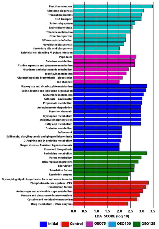 The incorporation of PICRUSt with the KEGG database to the results of LEfSe showed differences in the predicted functions of the microbiota of the initial samples and experimental groups (p < 0.05). In decreasing order, the most enriched group was the initial samples with 58 predicted functions, followed by the OEO100 group with 12 predicted functions, then the OEO75 and OEO125 groups with seven predicted functions, respectively, and the control group with six predicted functions (Figure 7, and Supplementary Materials for the complete figure).