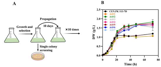 The initial strain was inoculated in 50 mL shake flasks and grown at 30 °C and 160 rpm. Every ten days, 5 mL of the culture was transferred to 50 mL of fresh YP. This process was repeated 10 times, during which evolved clones from different cycles were selected and tested. Simultaneously, samples of the same culture were transferred onto YP medium plates (yeast extract 10 g/L, peptone 20 g/L, and technical agar 20 g/L) to obtain approximately 500 cells per plate. The plates were incubated at 30 °C. After 5–7 days, the largest colonies were selected for more accurate screening. For each cycle of inoculation, the cultures completed four–five duplications. Single clones were screened for growth in 15 mL tubes containing 3 mL of a fresh medium (YP) and were grown at 30 °C. After 72 h, growth was measured at OD. The clones with larger colonies on plates and the best growth were named AAV1 through AAV7 and selected for further experiments.