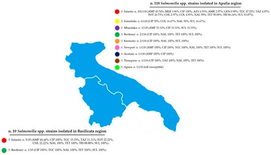 Salmonella isolates showed the following resistance percentages (Table 4): AMP (53/128) (41.41%), MER (4/128) (3.13%), CIP (122/128) (95.31%), AZY (7/128) (5.47%), AMK (3/128) (2.34%), GEN (1/128) (0.78%), TGC (53/128) (41.41%), TAZ (7/128) (5.47%), FOT (29/128) (22.66%), CHL (5/128) (3.91%), COL (6/128) (4.69%), NAL (119/128) (92.97%), TET (105/128) (82.03%), TRI (95/128) (74.22%), and SUL (111/128) (86.72%). Three isolates (2.34%) were sensitive to all antibiotics. The nine serotypes isolated with antimicrobial resistance are reported as follows (Table 5): S. Infantis (110/128) AMP (45.45%), MER (3.64%), CIP (100%), AZY (6.37%), AMK (2.73%), GEN (0.91%), TGC (46.36%), TAZ (5.45%), FOT (26.36%), CHL (4.55%), COL (4.55%), NAL (99.09%), TET (90.91%), TRI (86.36%), and SUL (93.64%); S. Enteritidis (6/128) CIP (50%), COL (16.67%), NAL (50%), and SUL (16.67%); S. Mbandaka (3/128) AMP (33.33%), CIP (33.33%), and SUL (33.33%); S. Bredeney (3/128) CIP (100%), TGC (33.33%), NAL (100%), TET (100%), and SUL (100%); S. Kentucky (2/128) CIP (100%), NAL (100%), and SUL (100%); S. Newport (1/128) AMP (100%), CIP (100%), TGC (100%), NAL (100%), TET (100%), and SUL (100%); S. Anatum (1/128) AMP (100%), and CIP (100%); S. Thompson (1/128) CIP (100%), TAZ (100%), NAL (100%), and TET (100%). These results were related to two regions in which samples were collected. In particular, 118 (92.18%) out of 128 strains were isolated in Apulia region as follows: S. Infantis (101/118) AMP (45.54%), MER (3.96%), CIP (100%), AZY (6.93%), AMK (2.97%), GEN (0.99%), TGC (47.52%), TAZ (4.95%), FOT (26.73%), CHL (2.97%), COL (4.95%), NAL (99%), TET (90.09%), TRI (86.14%), and SUL (93.07%); S. Enteritidis (6/118) CIP (50%), COL (16.67%), NAL (50%), and SUL (16.67%); S. Mbandaka (3/118) AMP (33.33%), CIP (33.33%), and SUL (33.33%); S. Bredeney (2/118) CIP (100%), NAL (100%), TET (100%), and SUL (100%); S. Kentucky (2/118) CIP (100%), NAL (100%), and SUL (100%); S. Newport (1/118) AMP (100%), CIP (100%), TGC (100%), NAL (100%), TET (100%), and SUL (100%); S. Anatum (1/118) AMP (100%) and CIP (100%); S. Thompson (1/118) CIP (100%), TAZ (100%), NAL (100%), and TET (100%). The 10 (7.82%) out of 128 strains isolated from samples collected in Basilicata region showed the following resistance: S. Infantis (9/10) AMP (44.44%), CIP (100%), TGC (33.33%), TAZ (11.11%), FOT (22.22%), CHL (22.22%), NAL (100%), TET (100%), TRI (88.88%), and SUL (100%); S. Bredeney (1/10) CIP (100%), TGC (100%), NAL (100%), TET (100%), and SUL (100%) (Figure 1). Out of 128 strains, 112 (87.5%) isolates showed MDR profiles (Table 6). Moreover, 16 isolates (12.5%) were confirmed to be ESBL producers.
