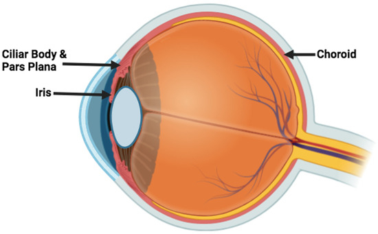Uveitis is a group of inflammatory conditions affecting the uveal tract (Figure 1), which consists of the iris, ciliary body, and choroid. It can also involve adjacent structures such as the retina, vitreous, and optic nerve. Uveitis is a leading cause of vision impairment and blindness globally [1,2]. It manifests with a range of symptoms, including eye redness, pain, light sensitivity, floaters, and blurred vision. This heterogenous group of inflammatory eye diseases may arise from infections, autoimmune responses, systemic conditions, ophthalmologic disorders, drug-induced reactions, or masquerade syndromes [3]. The condition typically affects young, working-aged individuals [4].