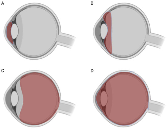 Anatomic classifications of uveitis. (A) Anterior uveitis primarily affects the iris, (B) intermediate uveitis targets the ciliary body, (C) posterior uveitis involves the retina and choroid, and (D) panuveitis involves the entire uveal tract. Figure generated using biorender.com.